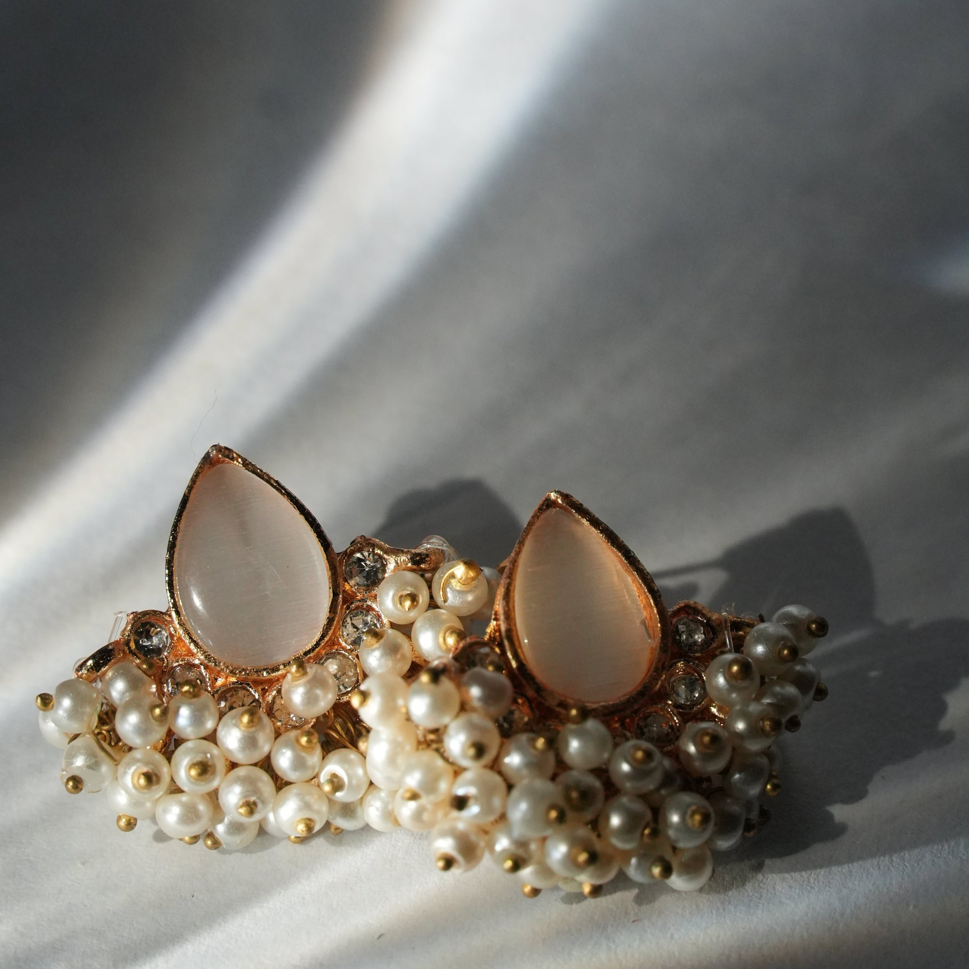 Designed to make a subtle statement, these studs pair a soft teardrop crystal with a lush cluster of mini pearls and gold-toned detailing. Feminine, radiant, and timeless — ideal for weddings, dinners, or adding a graceful edge to your everyday style.