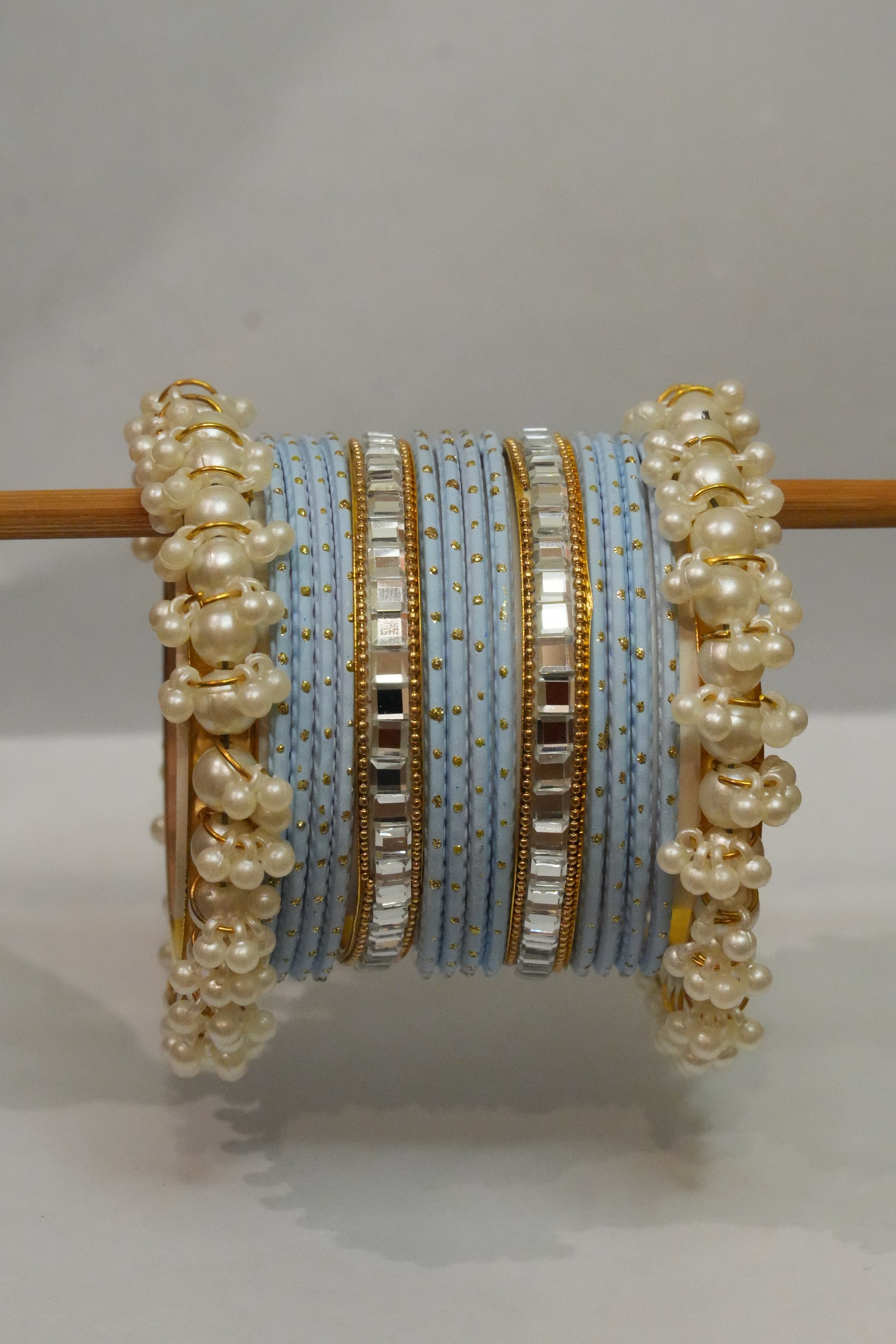 A timeless bangle set that brings together tradition and beauty. The combination of delicate churiyaan, shimmering mirror accents, and soft pearl detailing creates a refined, feminine look — perfect for festive occasions, weddings, or a graceful everyday statement.