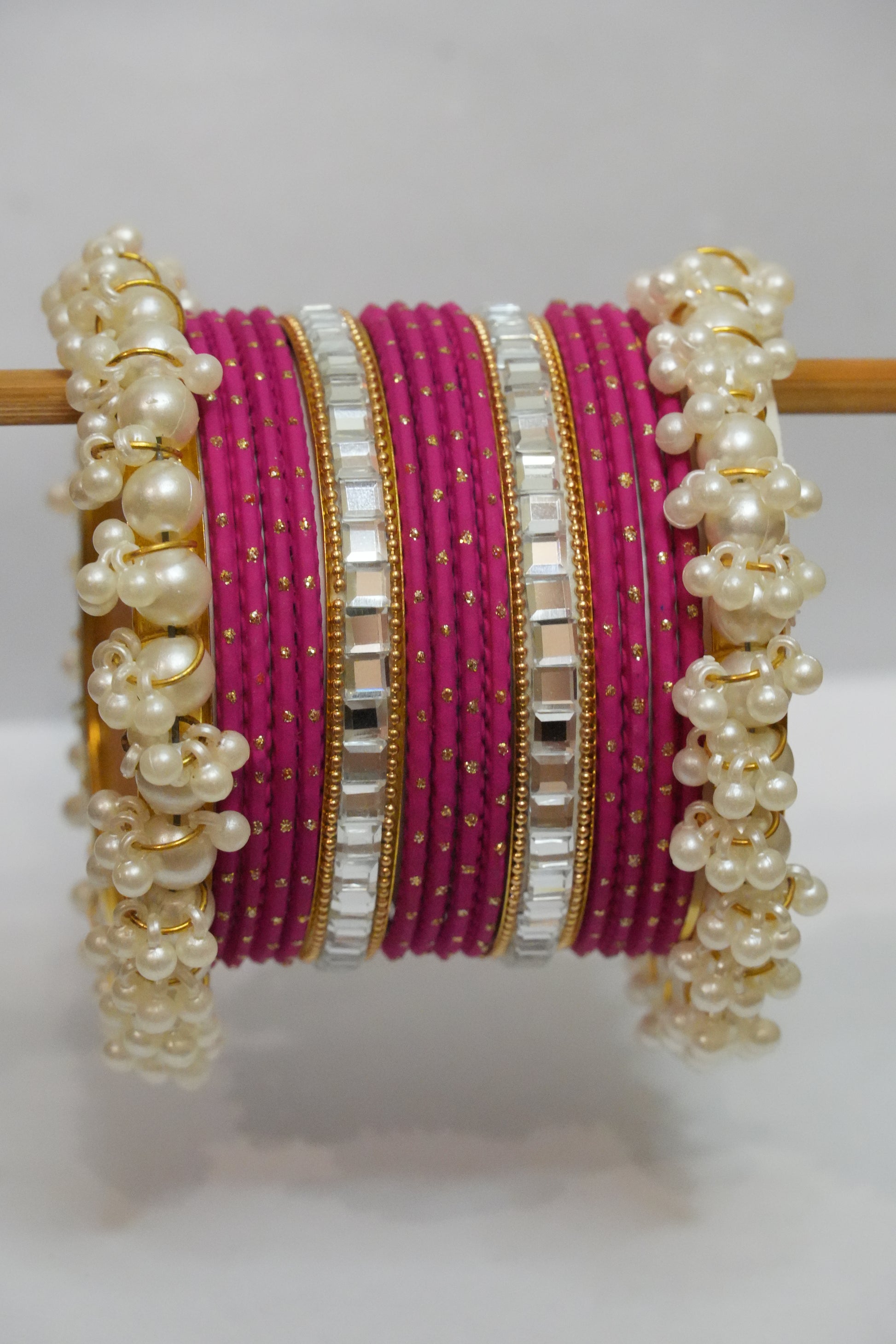 12 churiyaan, 2 mirror bangles & 2 pearl karay — just the right stack for any festive fit!